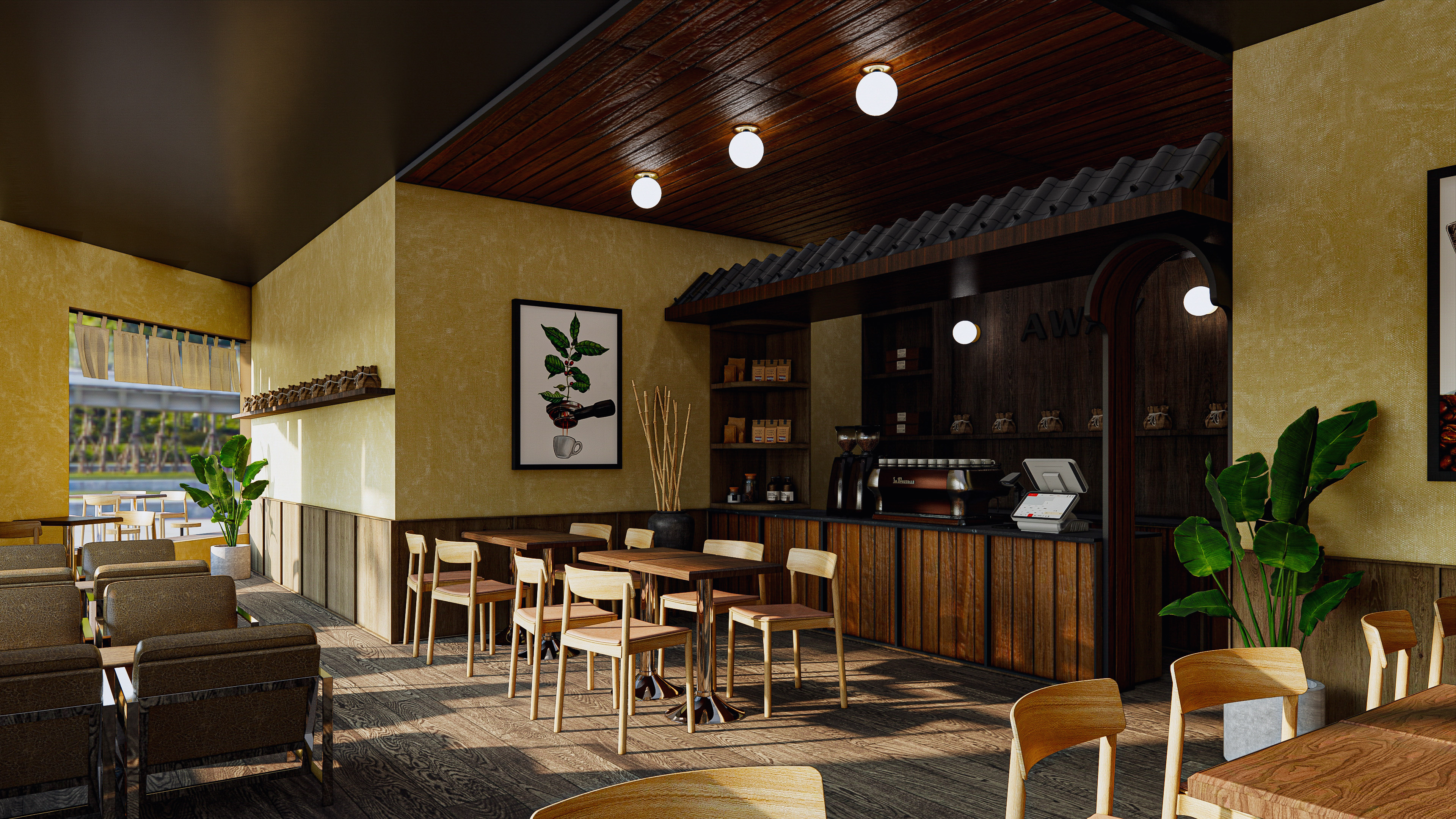 • Vận hành thông minh: quầy take-away ở nhịp trái cho giờ cao điểm; ổ điện ẩn, hút mùi & tiêu âm kín để giữ chất êm của quán.
