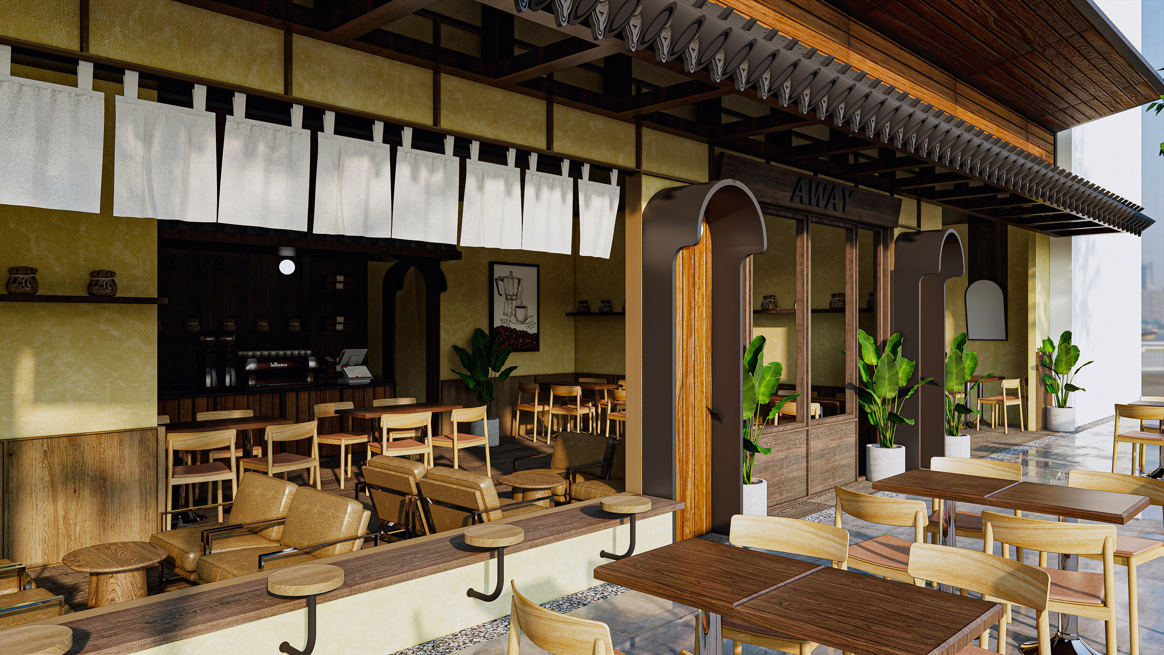Hiên sâu mái ngói đen, khung gỗ ấm và tường vữa vàng nhạt gợi cảm giác thân thuộc như góc phố cũ. Cửa vòm mở rộng, rèm noren trắng cho quầy take-away; cây xanh dọc mặt tiền làm mềm không gian và kéo ánh nhìn từ ngoài phố vào bên trong. Bố cục 3 nhịp rõ ràng: hiên mở – phòng ấm – sân ngoài trời. Ban ngày đón gió và nắng nhẹ; tối đến lên ánh vàng 2700–3000K cho những cuộc trò chuyện êm.