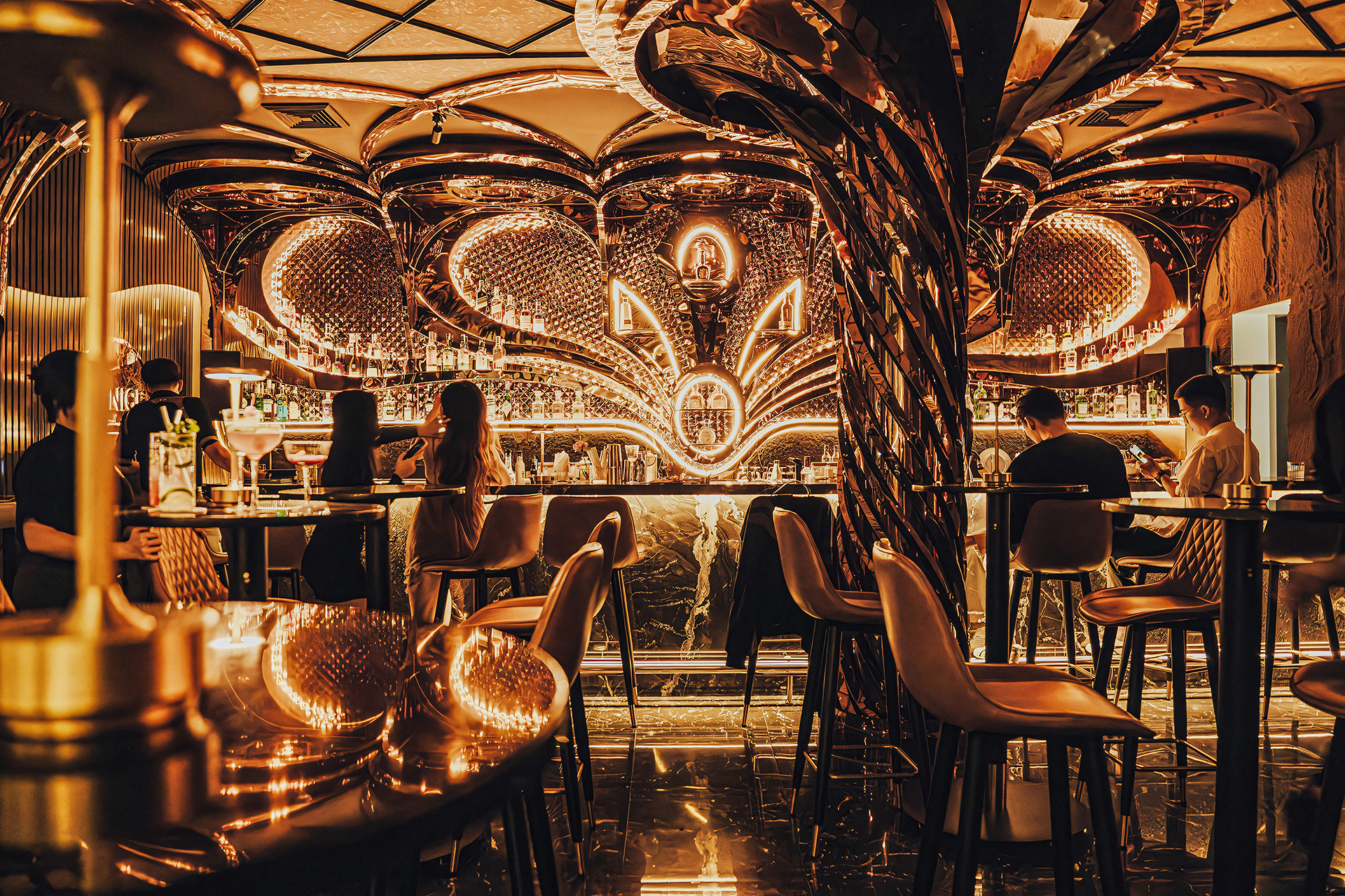 🔸 Tầng 1 – Bar cao cấp: Không gian bar lung linh ánh kim, sử dụng inox mạ đồng uốn nghệ thuật, trụ trần điêu khắc ánh sáng – tạo nên một không gian ảo ảnh lộng lẫy.