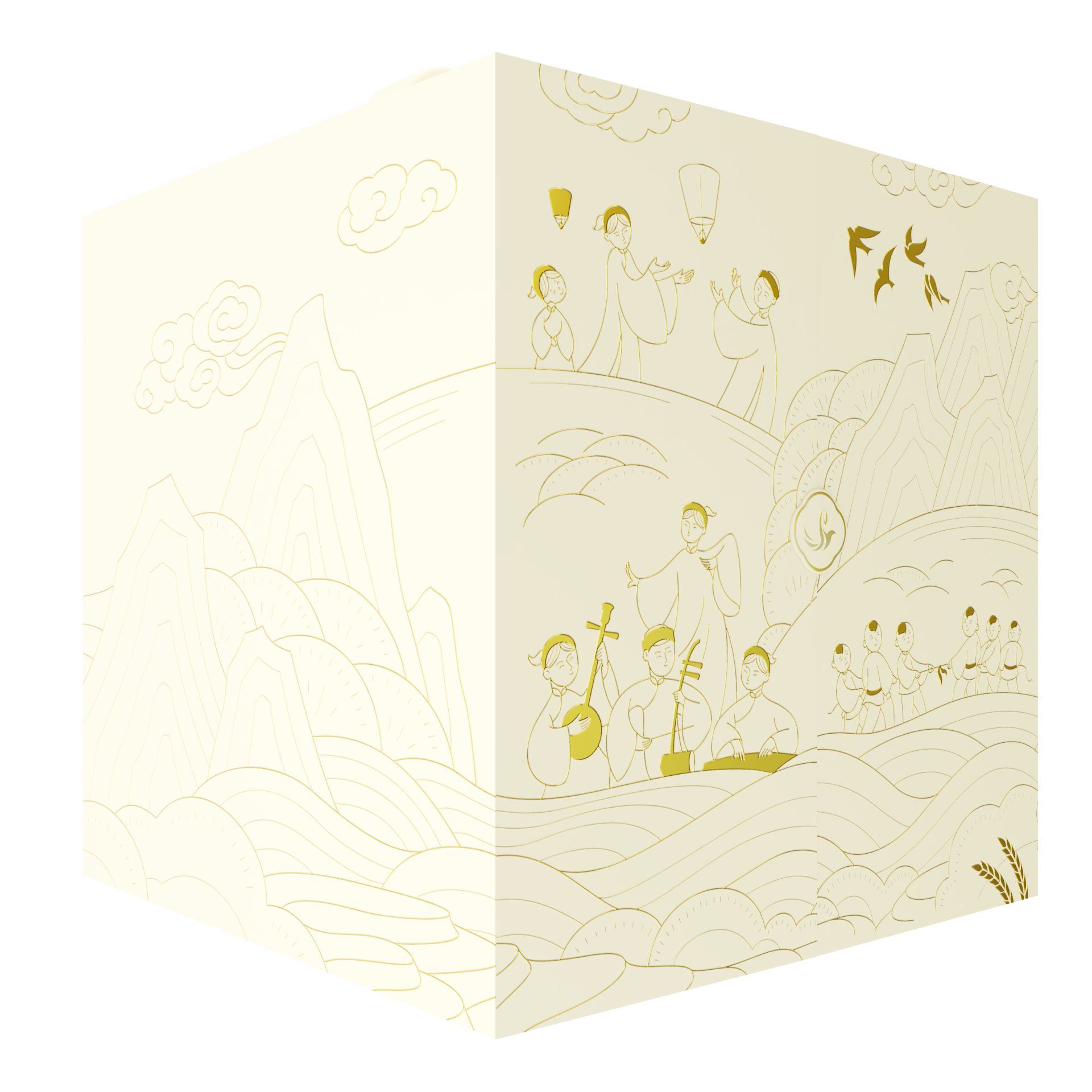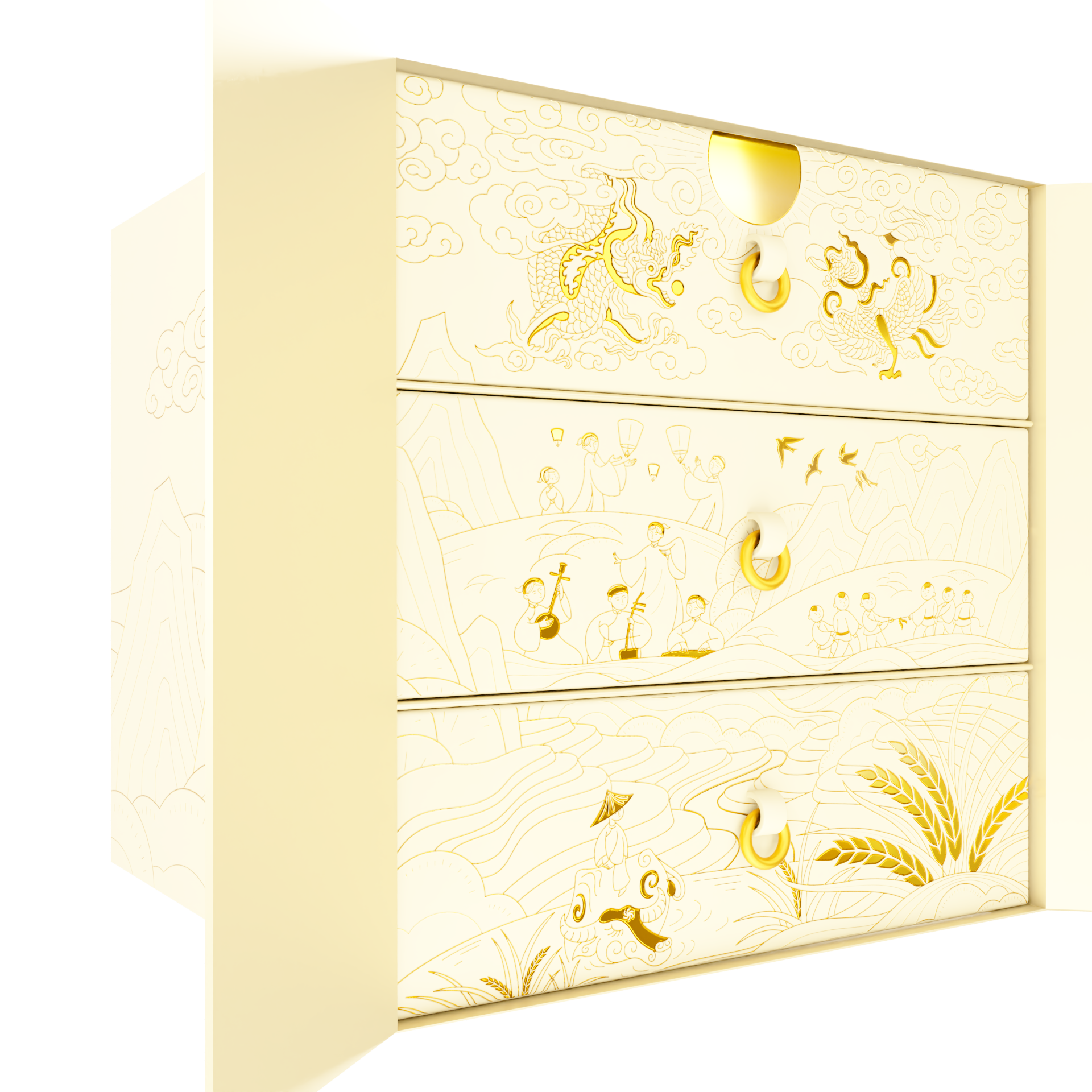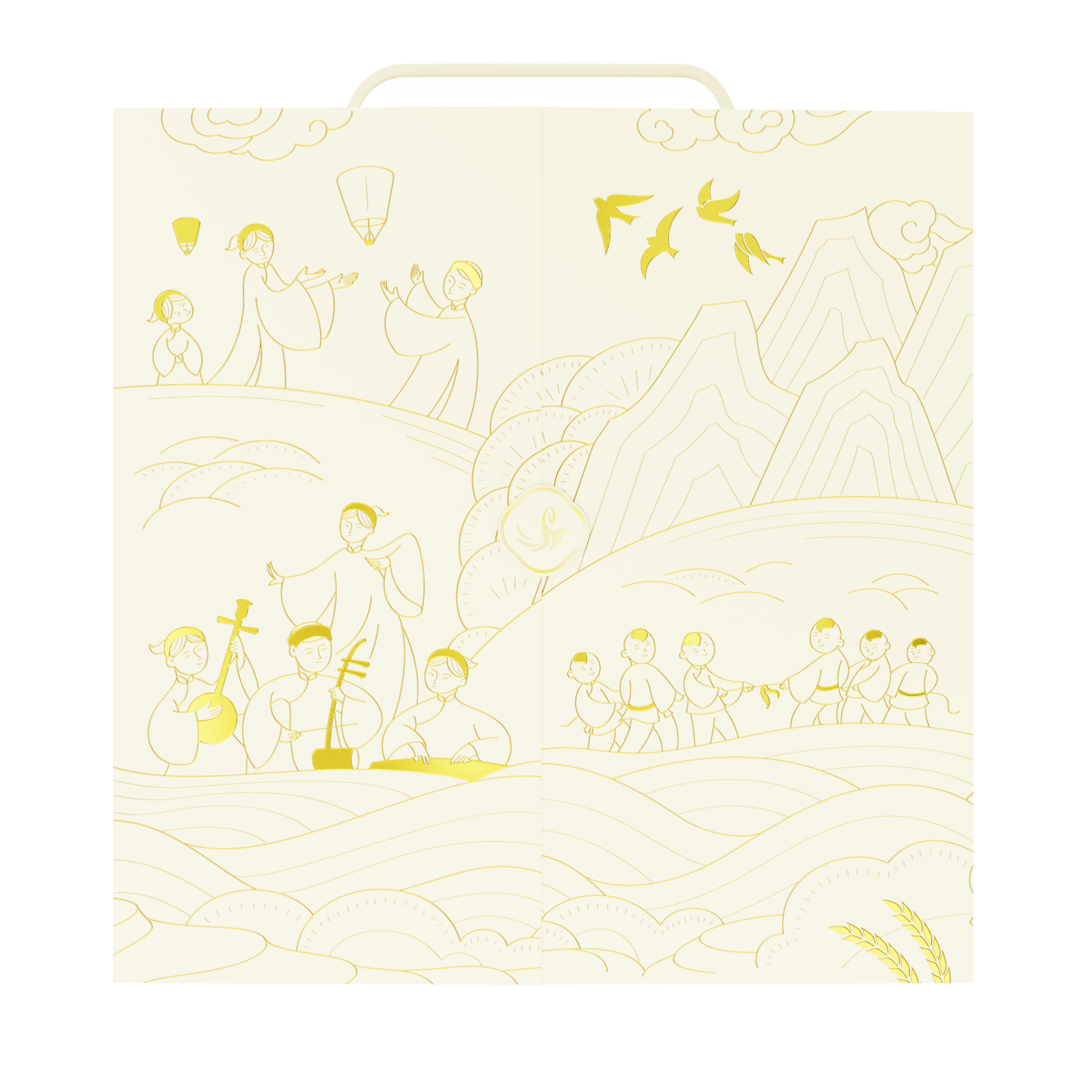 Inside every gift box, there is more than what you can hold. There is a hand-drawn, one-of-a-kind artwork created by Độc Mác artists—telling a Vietnamese story of reunion: lion dance, festival drums, clouds and waves, mountains, lotus, carp, and a family in áo dài.