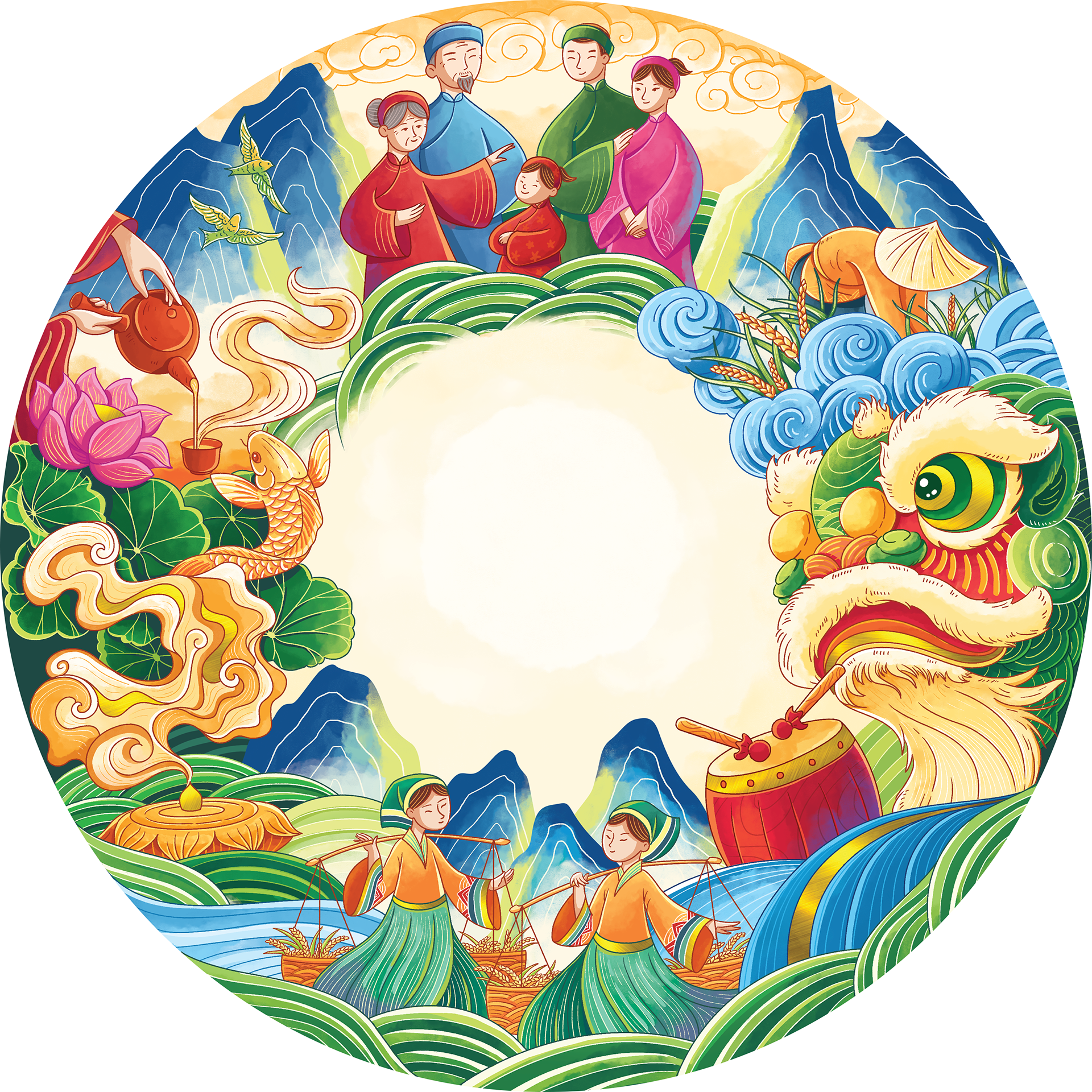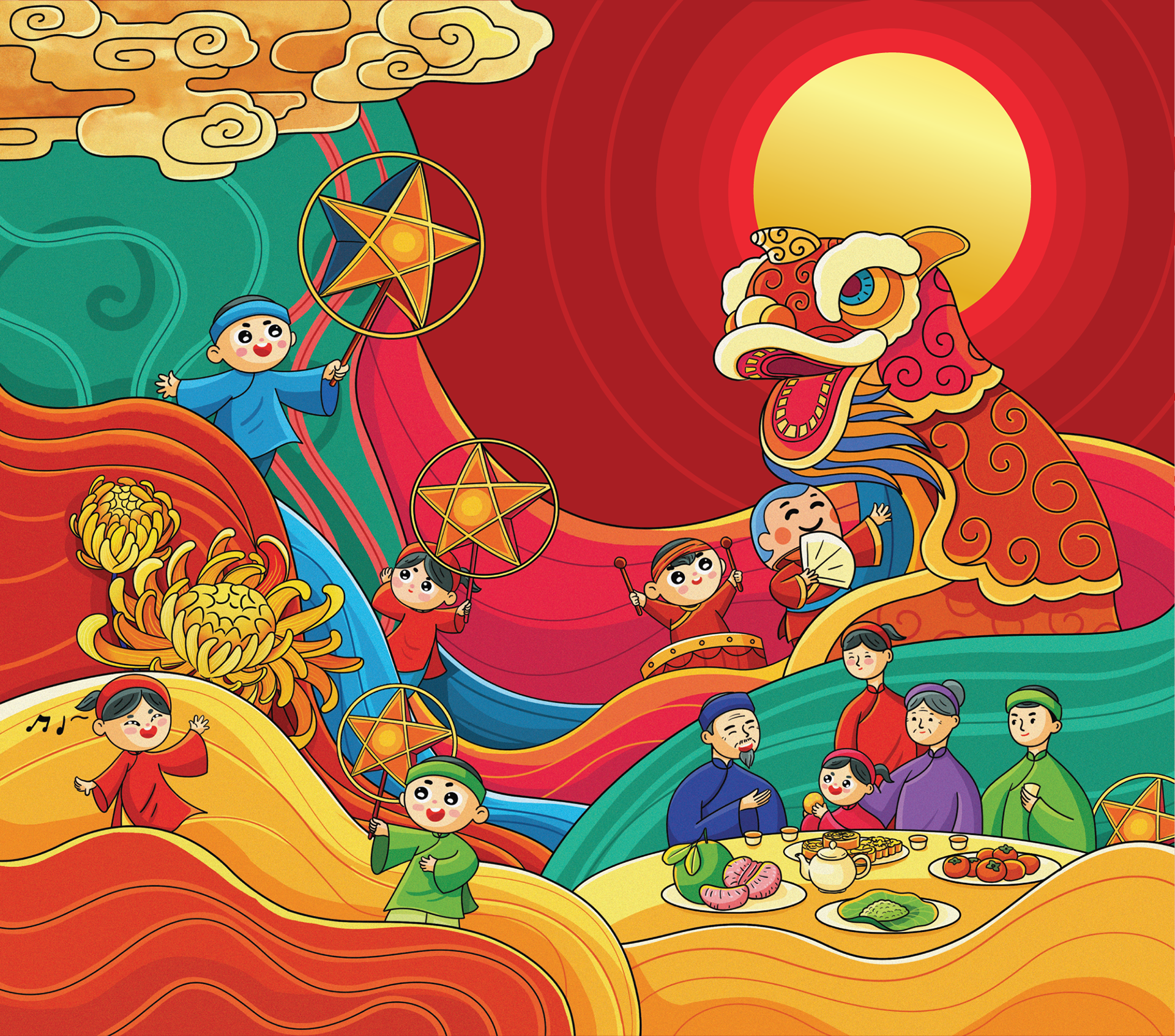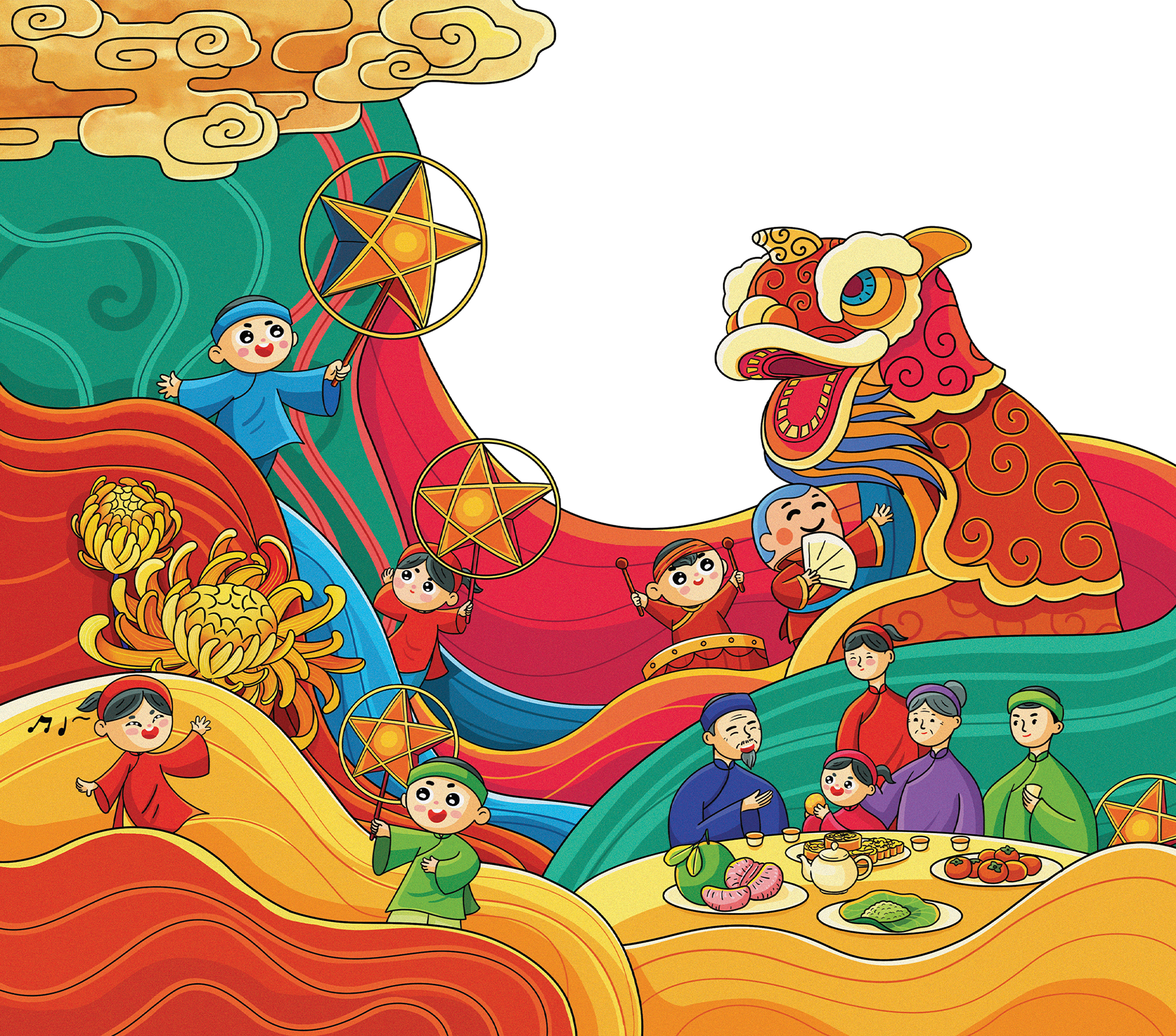 Inside every gift box, there is more than what you can hold. There is a hand-drawn, one-of-a-kind artwork created by Độc Mác artists—telling a Vietnamese story of reunion: lion dance, festival drums, clouds and waves, mountains, lotus, carp, and a family in áo dài.