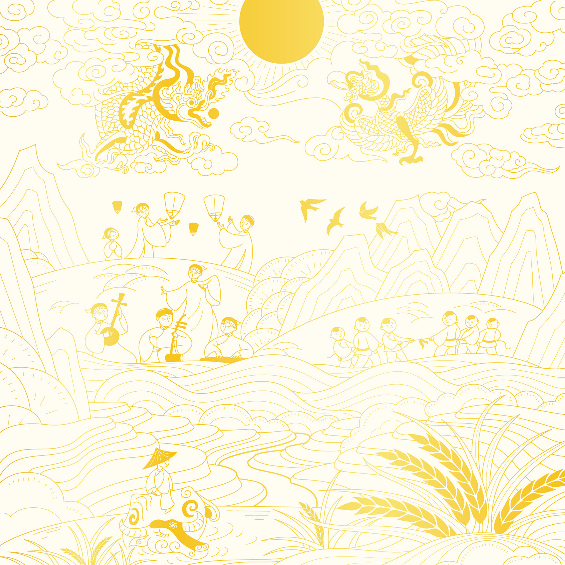 Folk art, modern language. Inspired by Đông Hồ and Hàng Trống traditions, we reinterpret them with contemporary composition, clear light–dark contrast, and gold accents reminiscent of vintage garments.